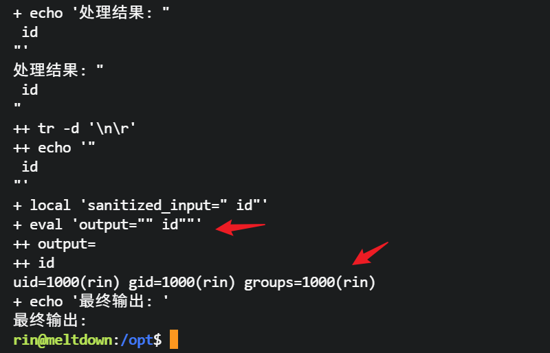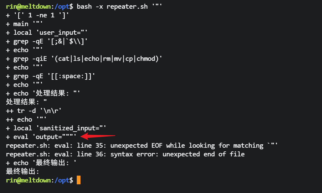 尝试使用 bash -x 执行脚本,方便调试,因为eval "output=\"$sanitized_input\"" 这里使用双引号包裹变量,可以尝试给一个双引号,看看会发生什么