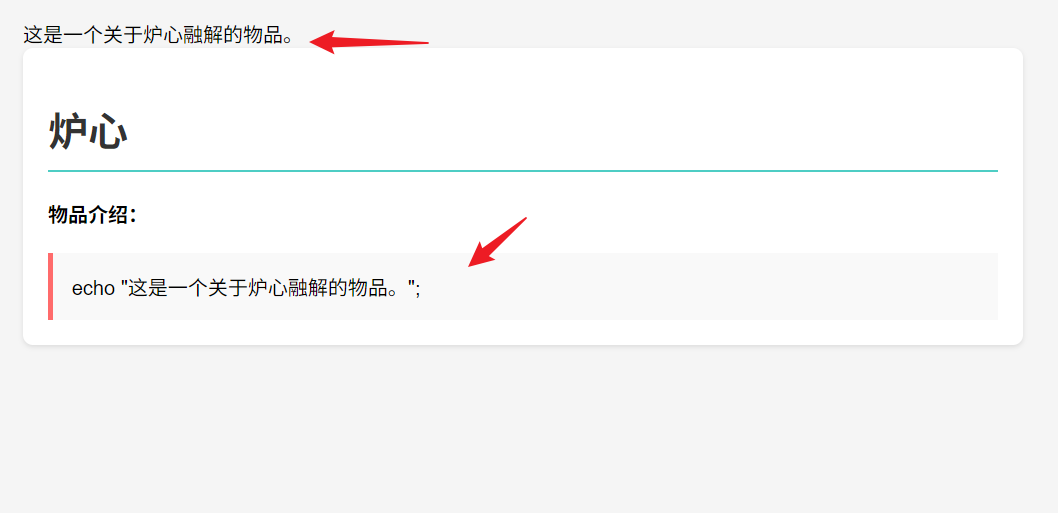 点击物品列表,进入新页面,可以看到物品描述中包含 echo 语句,并且其输出会直接在页面上展示,说明后台很可能是直接执行了数据库中存储的描述字段内容,这里存在潜在的代码执行风险。