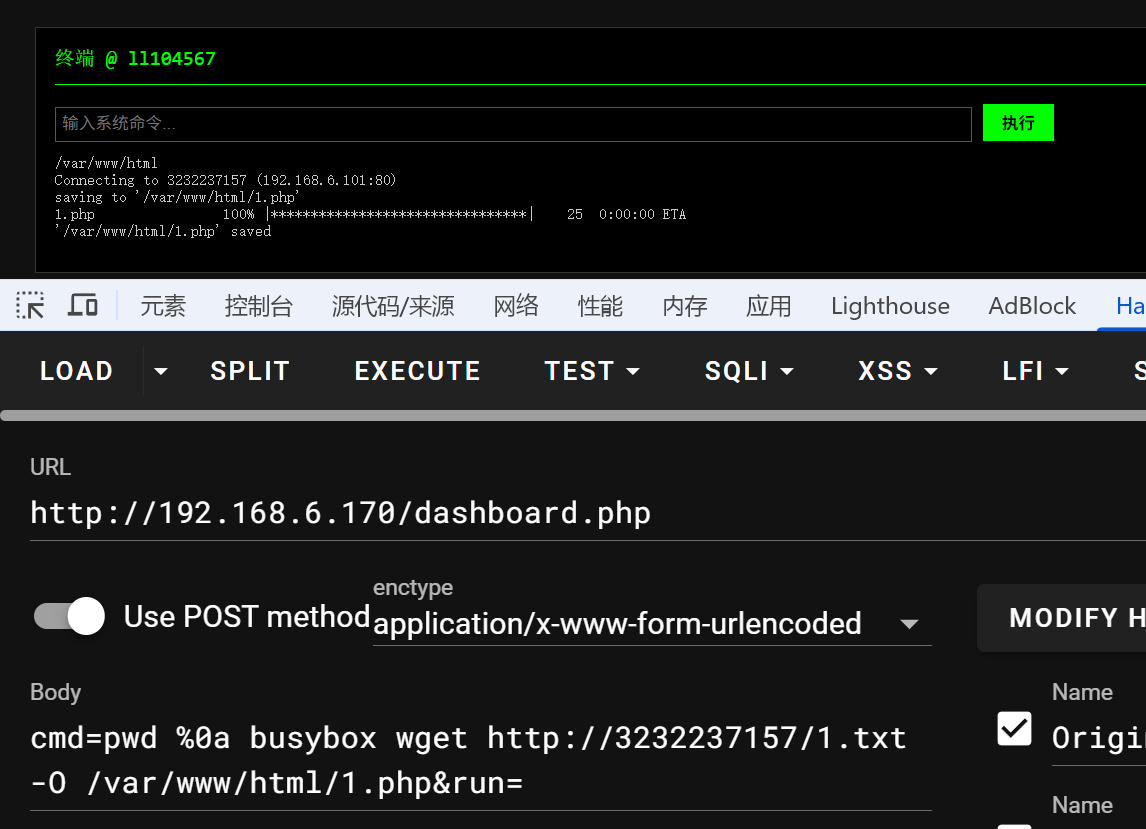 进入 dashboard.php 页面,测试出可以执行一些命令,如 id、pwd、uname 等