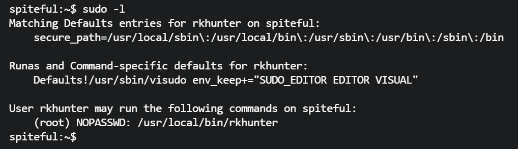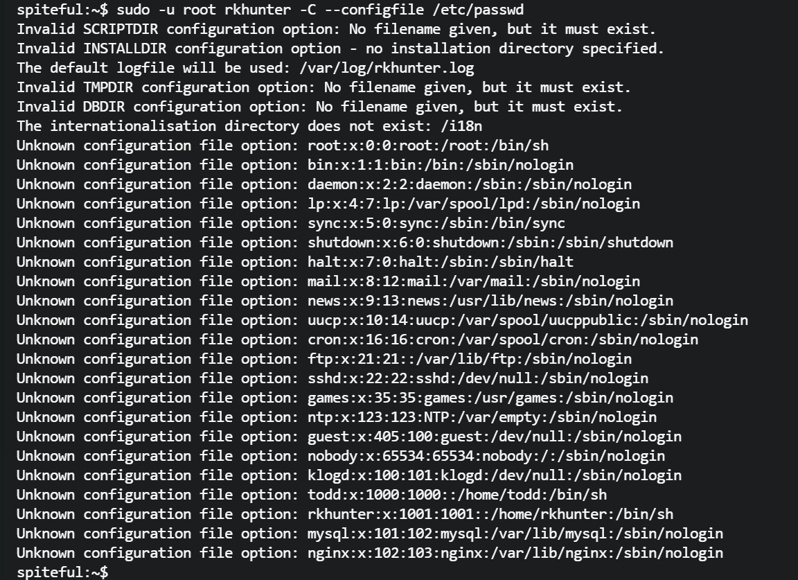 spiteful:~$ sudo -u root rkhunter -C --configfile /etc/passwd