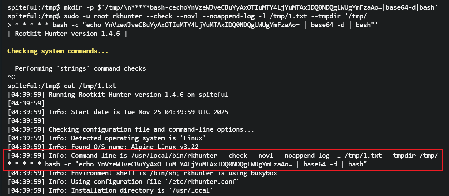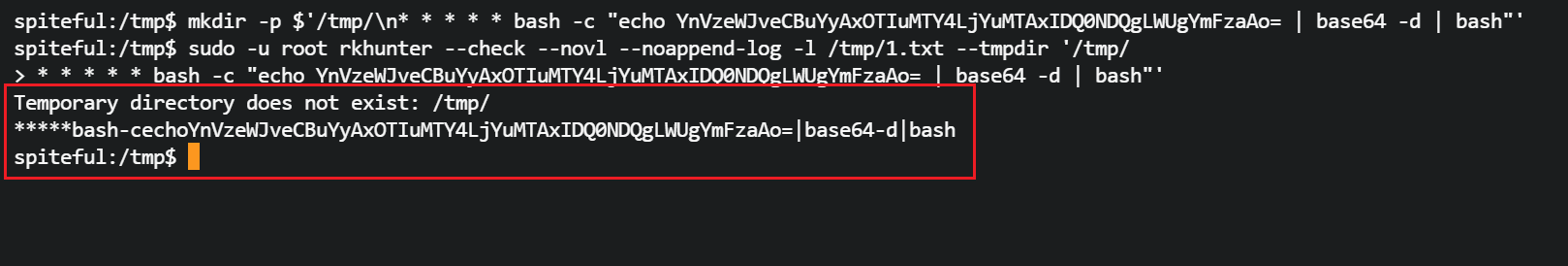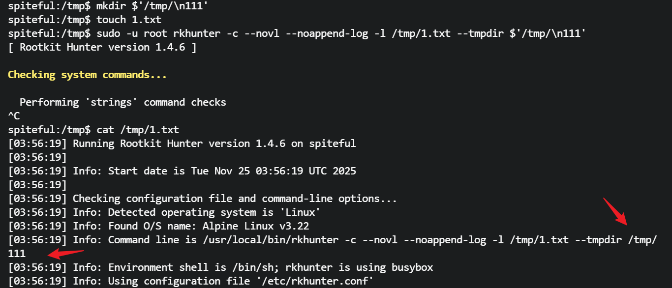 spiteful:/tmp$ sudo -u root rkhunter -c --novl --noappend-log -l /tmp/1.txt --tmpdir $'/tmp/\n111'