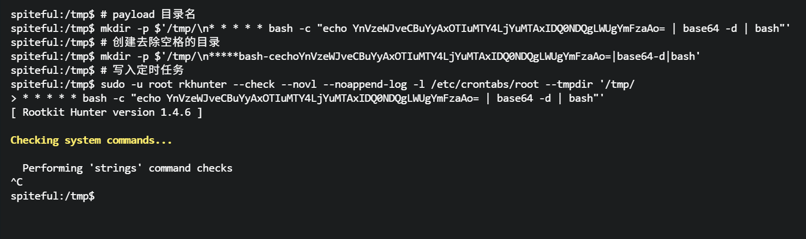 有一点你需要发现,--tmpdir 参数指定的目录,在 rkhunter 运行时,对目录名里出现的空格会出现不一致的效果,rkhunter 认为目录不应该出现空格,他会检查是否存在去除空格后的目录,给他单独创建,符合条件即可