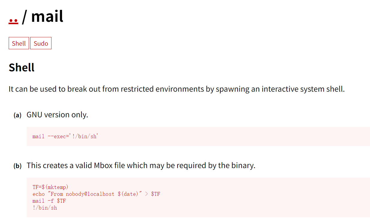 gtfobins 里可以找到相关利用姿势,可以通过 mail 命令的交互式shell执行命令,https://gtfobins.github.io/gtfobins/mail/ (opens new window)