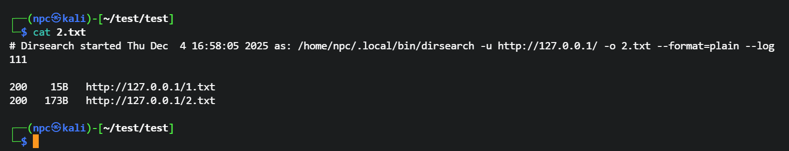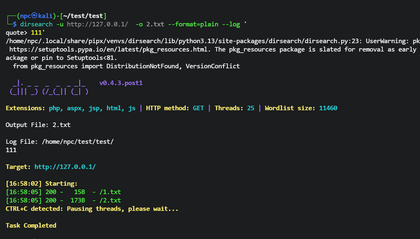 └─$ dirsearch -u http://127.0.0.1/ -o 2.txt --format=plain --log '