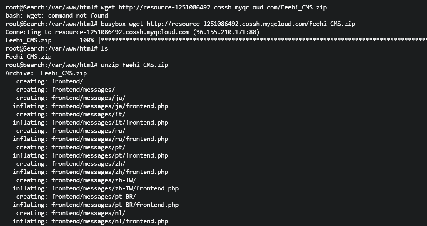 root@Search:/var/www/html# busybox wget http://resource-1251086492.cossh.myqcloud.com/Feehi_CMS.zip