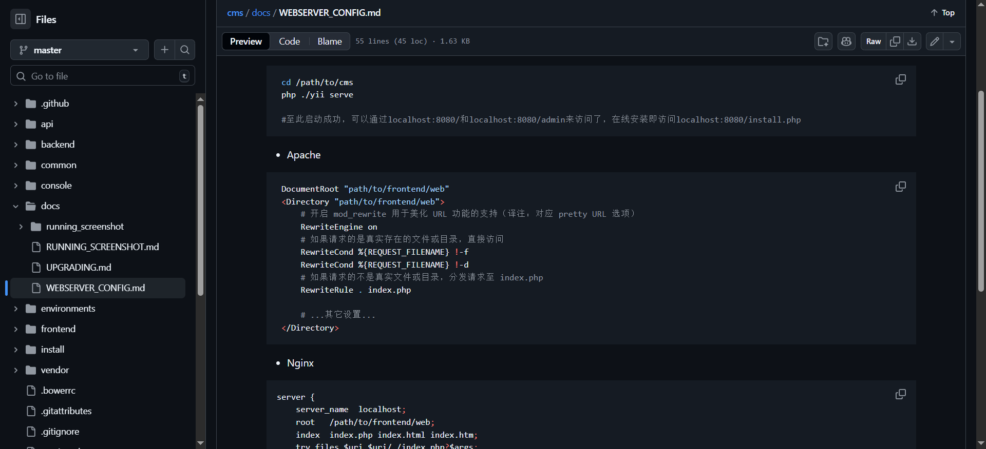 然后在第二个配置文档说明,配置一下 apache web根目录https://github.com/liufee/cms/blob/master/docs/WEBSERVER_CONFIG.md (opens new window)