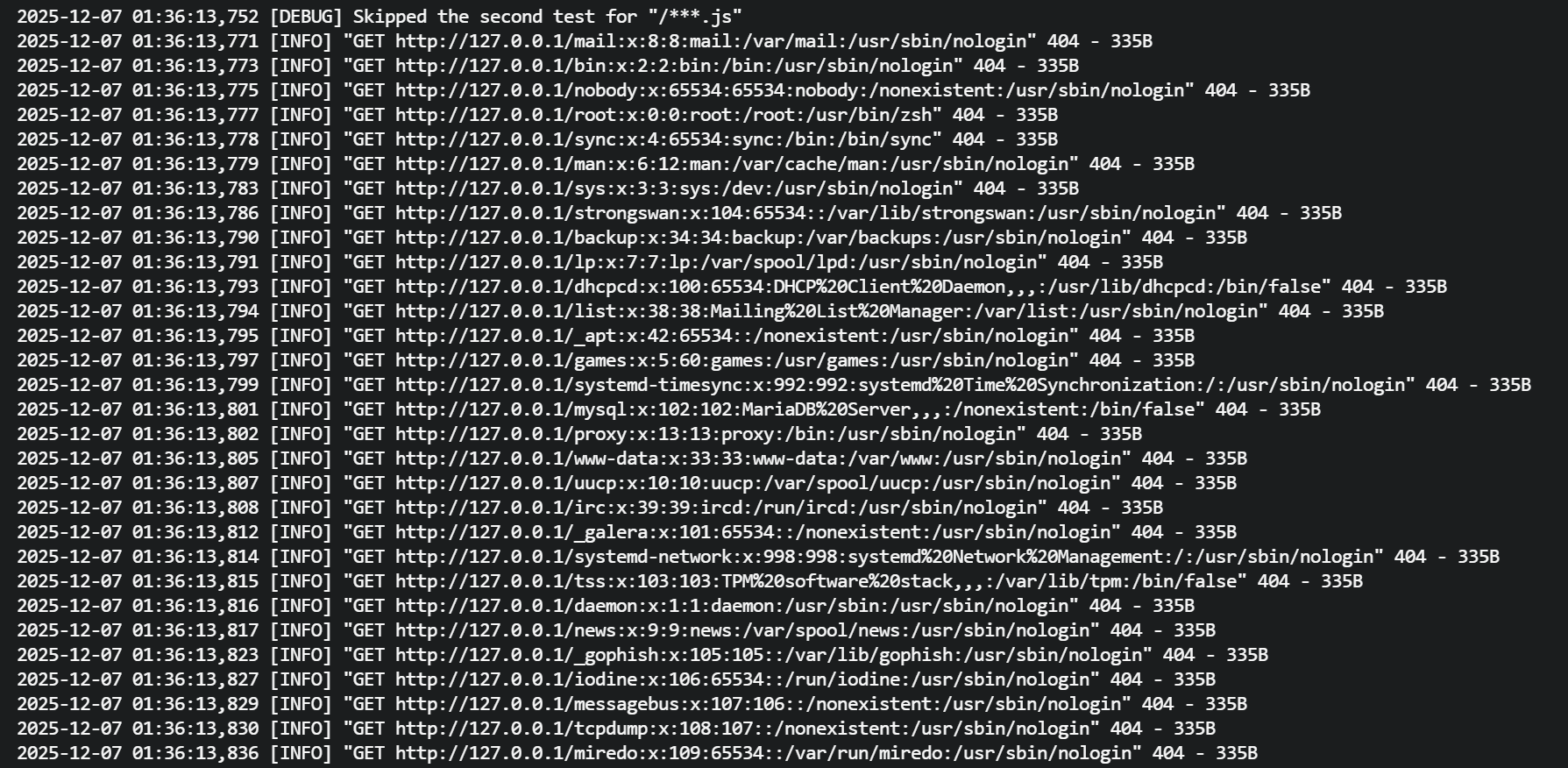 2025-12-07 01:36:13,771 [INFO] "GET http://127.0.0.1/mail:x:8:8:mail:/var/mail:/usr/sbin/nologin" 404 - 335B