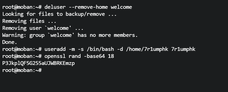 deluser --remove-home welcome