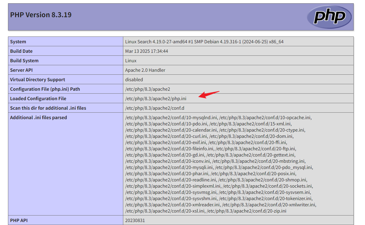 从 phpinfo 信息里找到 php.ini 配置文件路径,确认配置文件位置正确,且配置符合预期。