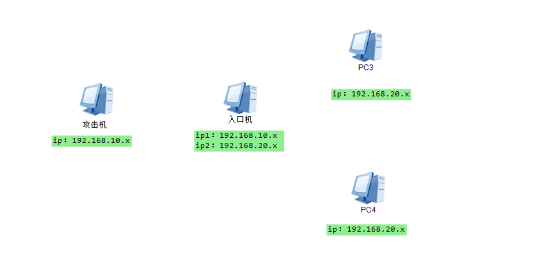 例如上图中所示拓扑,192.168.10.x网段的攻击机无法直接访问192.168.20.x网段内网主机,入口机存在192.168.10.x、192.168.20.x两个网卡,在拿下入口机meterpreter后,让这台入口机转发流量实现访问内网