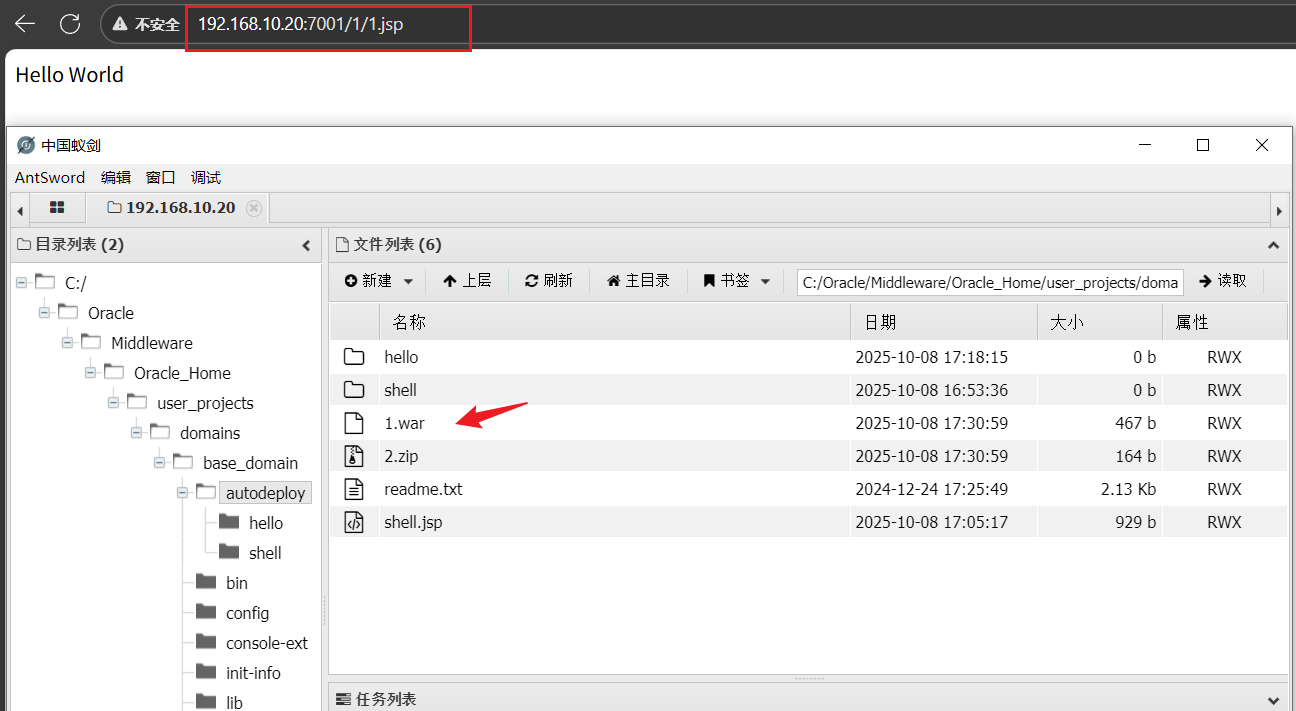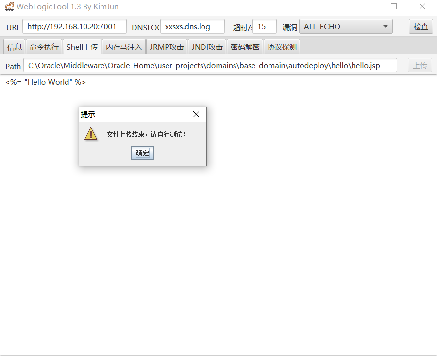 在绝对路径C:\Oracle\Middleware\Oracle_Home\user_projects\domains\base_domain\autodeploy\hello\hello.jsp